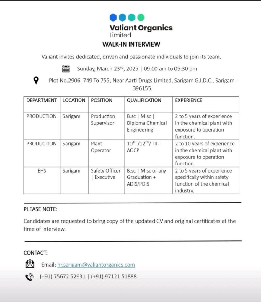 Qualification:B.sc | M.sc | Diploma Chemical