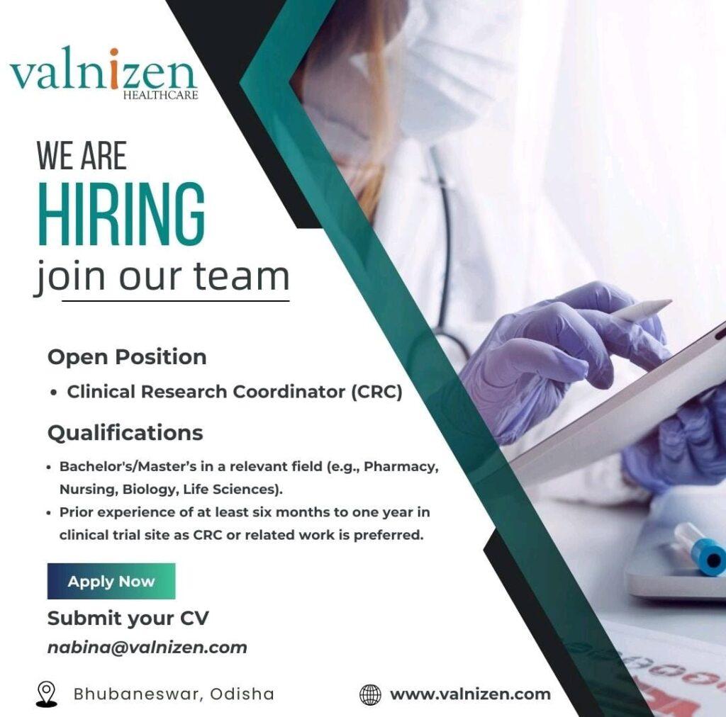 Valnizen Healthcare hiring for Clinical Research Coordinator (CRC) @ Bhubaneswar, Odisha