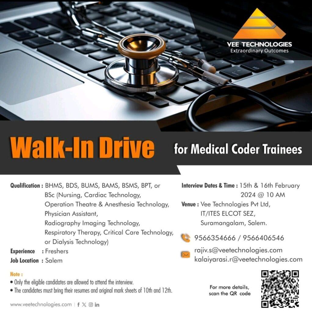 Vee Technologies Walk-In Drive for Medical Coding Fresher’s on 15th & 16th February 2024