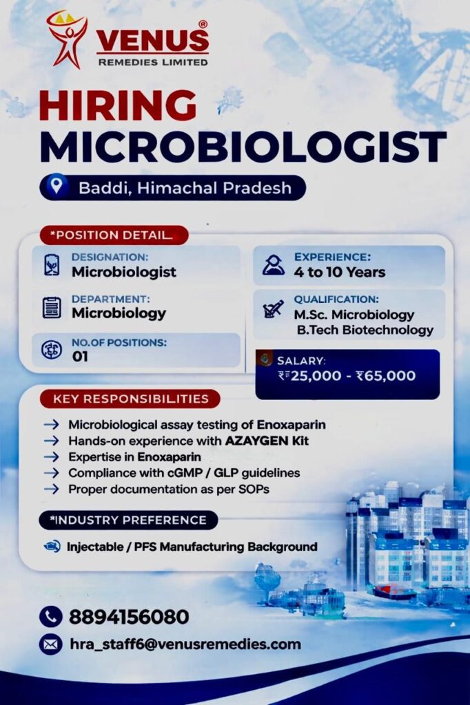 SEO Title: Venus Remedies Hiring Microbiologist in Baddi | 4-10 Years Exp | Enoxaparin Assay Jobs