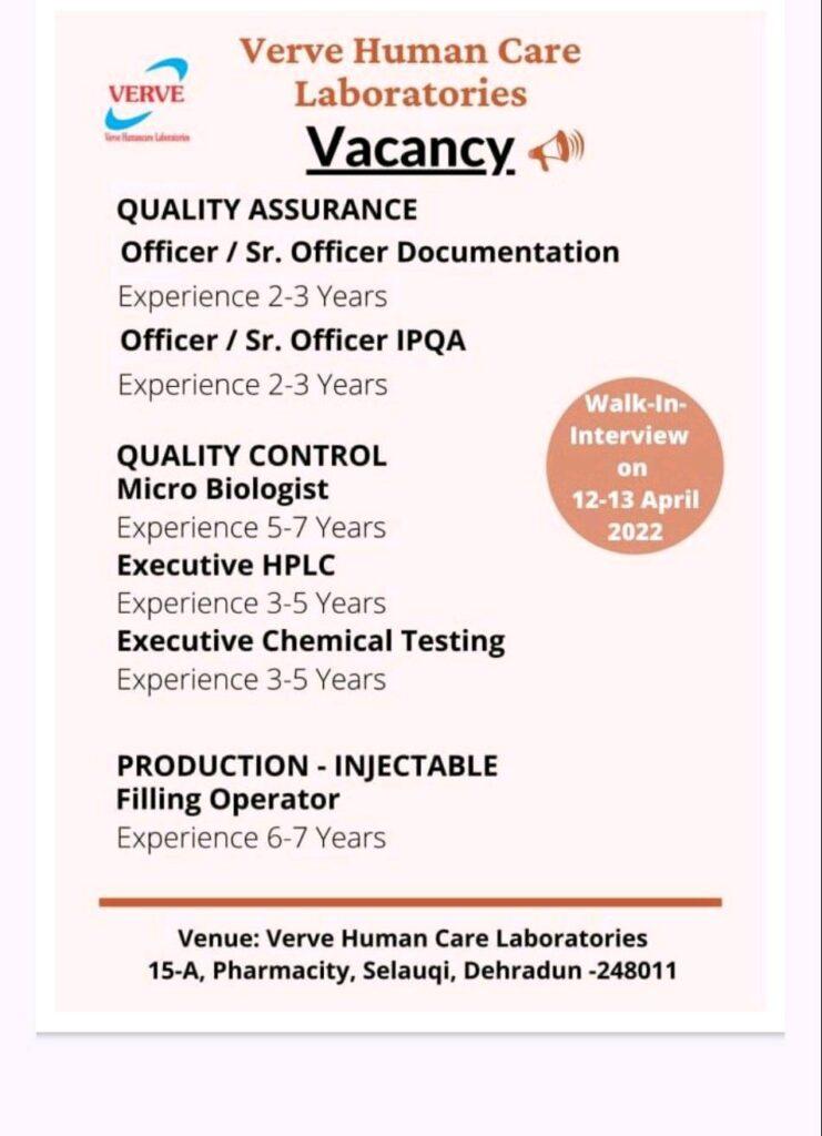 Verve Human Care Laboratories Walk in Interview for QA, QC & Production on 12th -13th April 2022