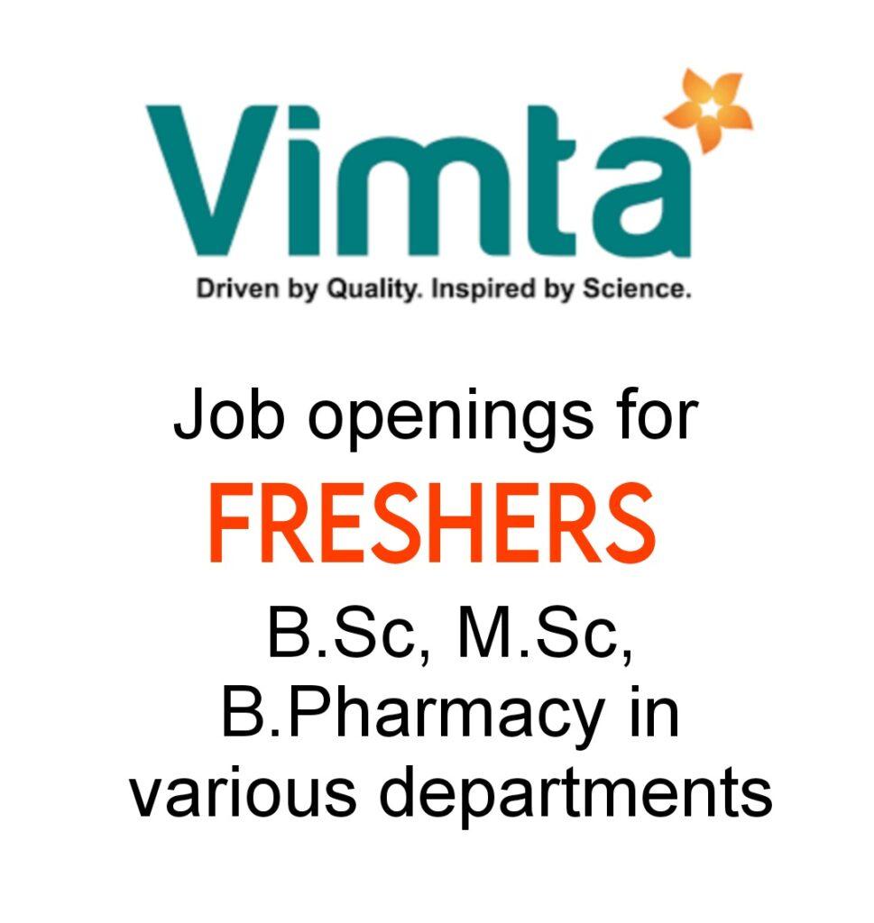 Vimta- Job openings for Freshers B.Sc, M.Sc, B.Pharmacy in various departments- Apply Now