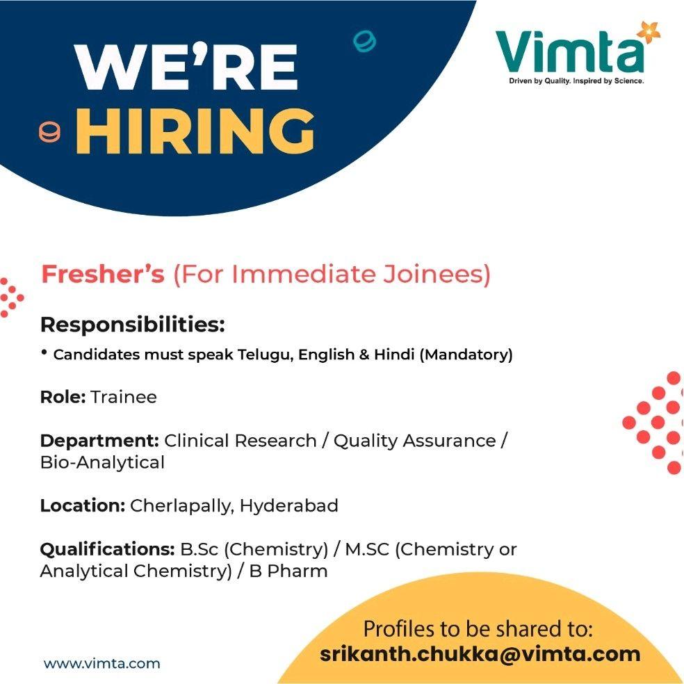 Vimta Labs Limited hiring B.Pharm, M.Sc, B.Sc Freshers in Clinical Research / Quality Assurance/ Bio-Analytical Department