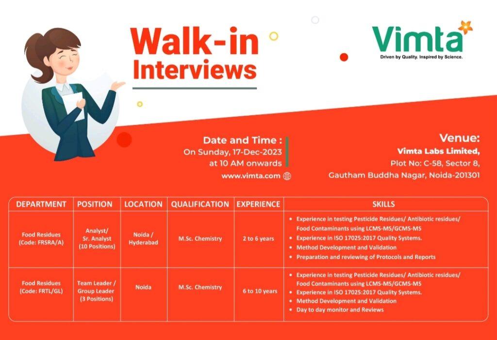 Vimta Labs Limited walk in interview on Sunday, 17-Dec-2023 | Food Residues | Noida