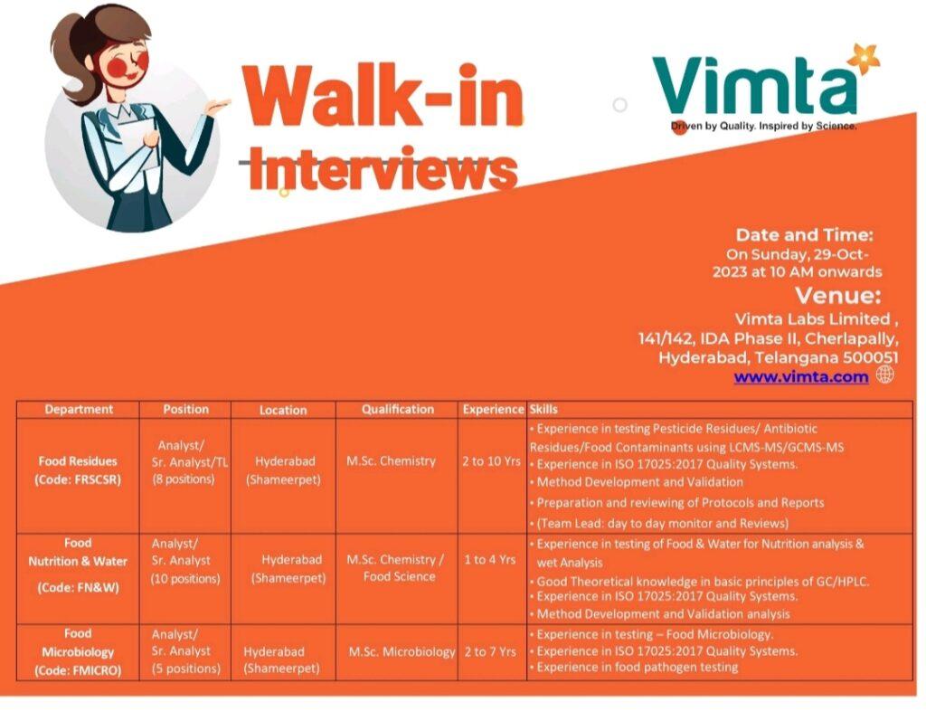 Vimta Labs Limited Walk-in Interviews on Sunday, 29-Oct- 2023@ Cherlapally, Hyderabad