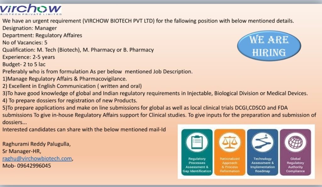 Virchow Biotech Pvt Ltd urgent requirement for Manager – Regulatory Affaires department