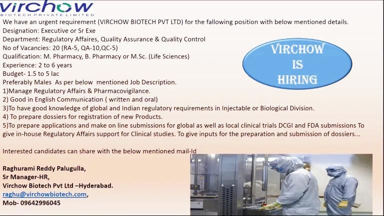 Virchow Biotech Pvt. Ltd urgent requirement for Regulatory Affaires, Quality Assurance & Quality Control department