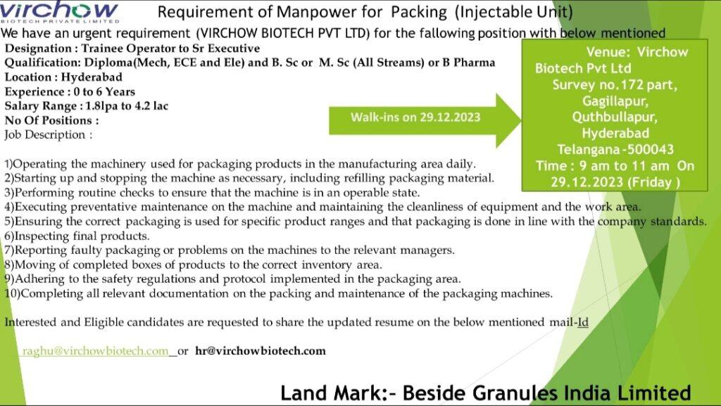 Virchow Biotech Pvt Ltd. walk in interview for Diploma and B. Sc or M. Sc (All Streams) or B. Pharma Freshers & experience on 29.12.2023