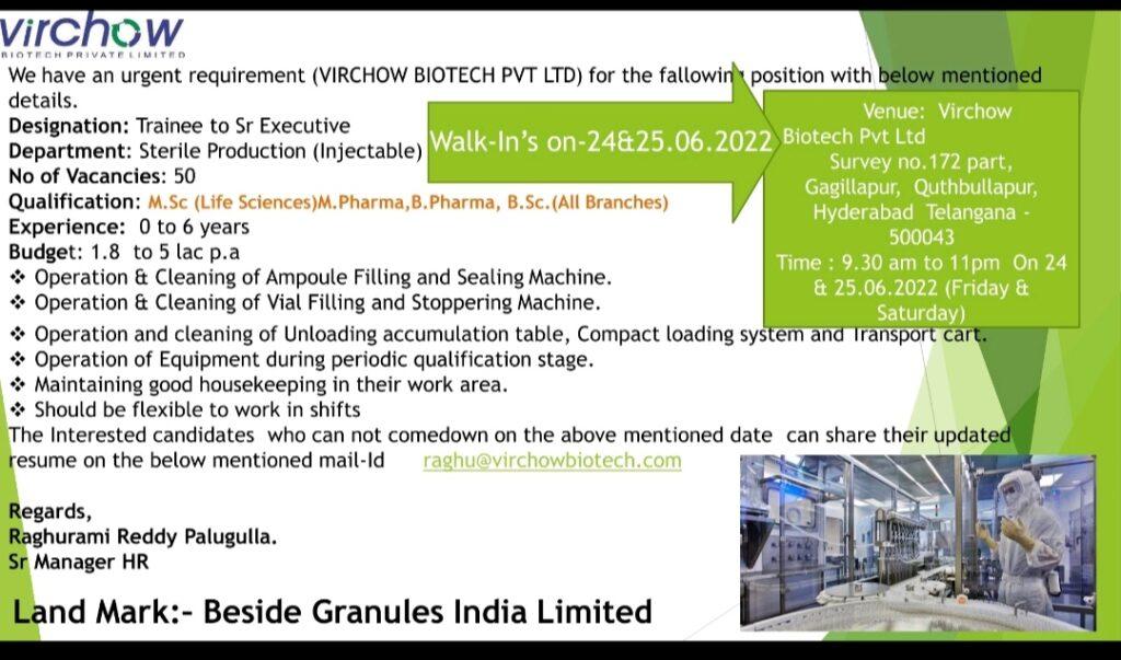 Virchow Biotech Pvt Ltd Walk In Interview for FRESHERS & experience in Production, QA & QC on 24th & 25th June 2022 || 80 Vacancies