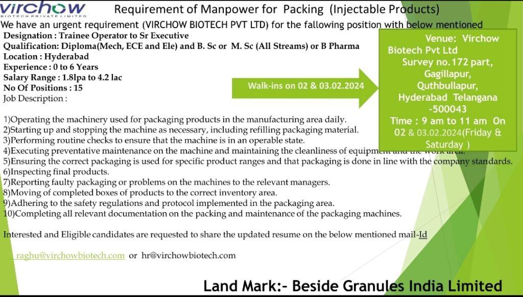 Virchow Biotech Pvt Ltd walk in interview for Trainee Operator to Sr Executive on 02 & 03.02.2024