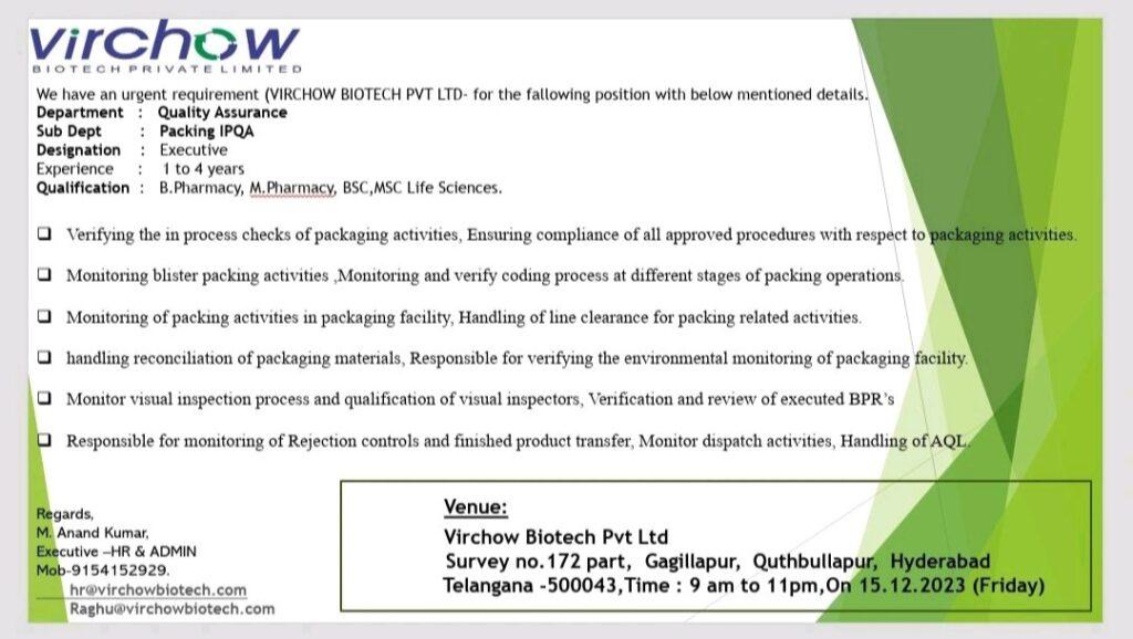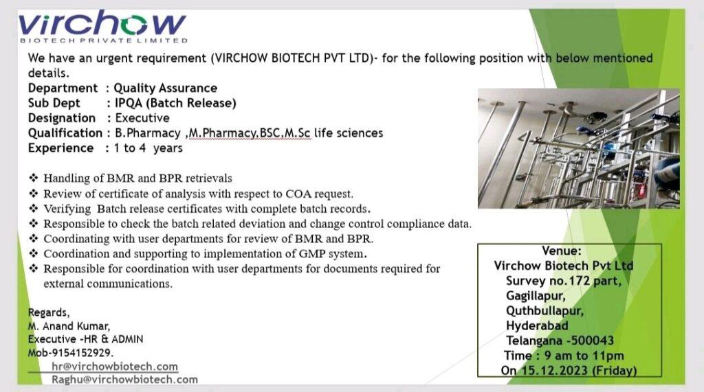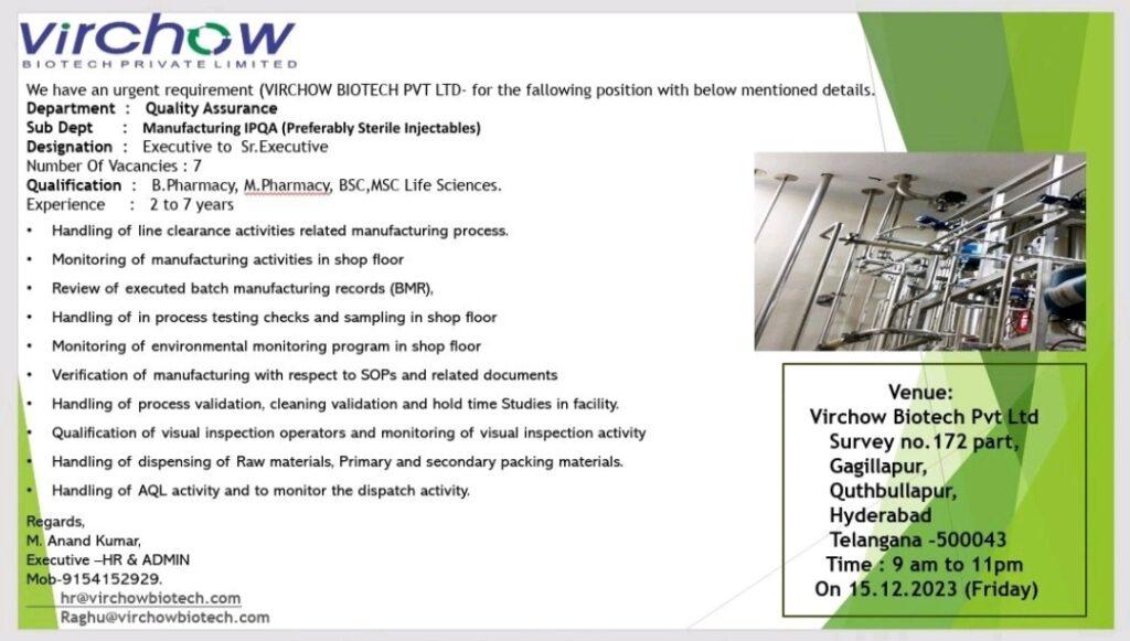 Greetings from Virchow Biotech Pvt Ltd!!! we are conducting walk in for the following Department on 15 December 2023(Friday).@ “Virchow Biotech” Survey No.172 part, Gagillapur, Qutbullapur, Medchal Malakajgiri (Dt), Hyderabad, Telangana, India 500043.