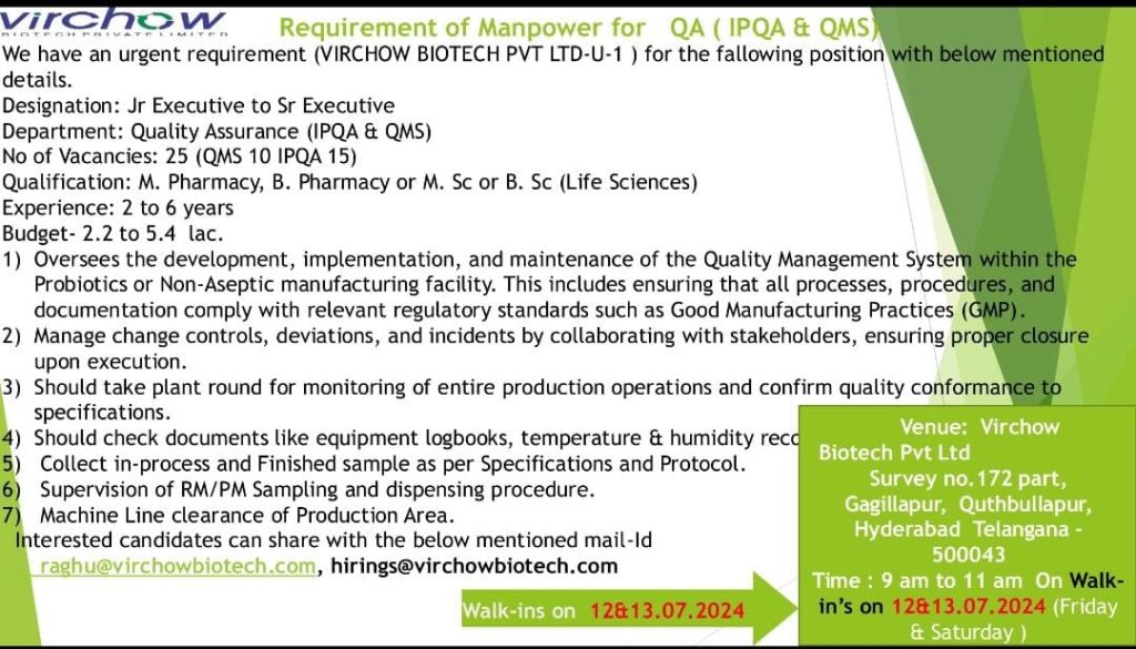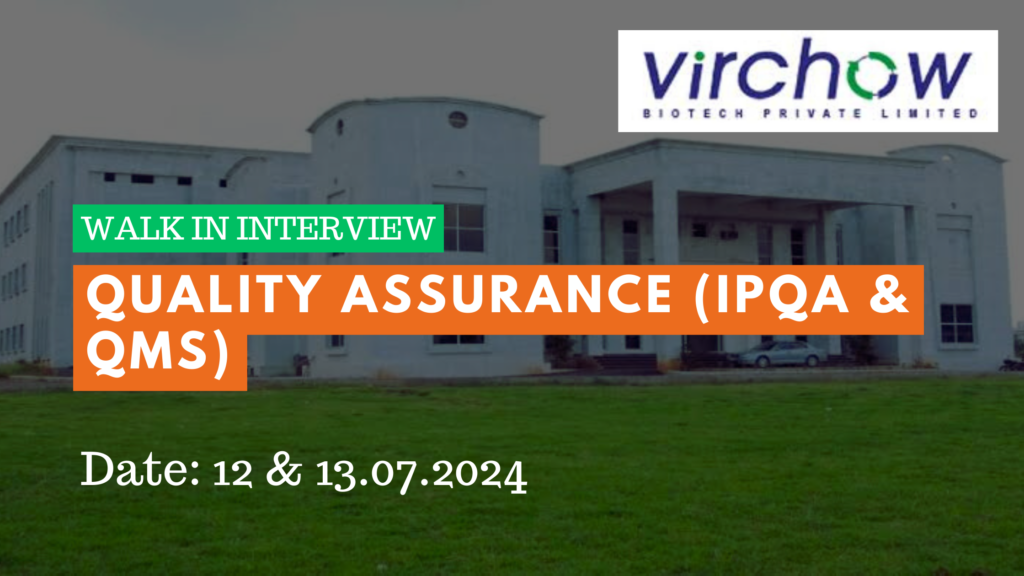 Virchow Biotech walk in for Quality Assurance (IPQA & QMS) on 12 & 13.07.2024
