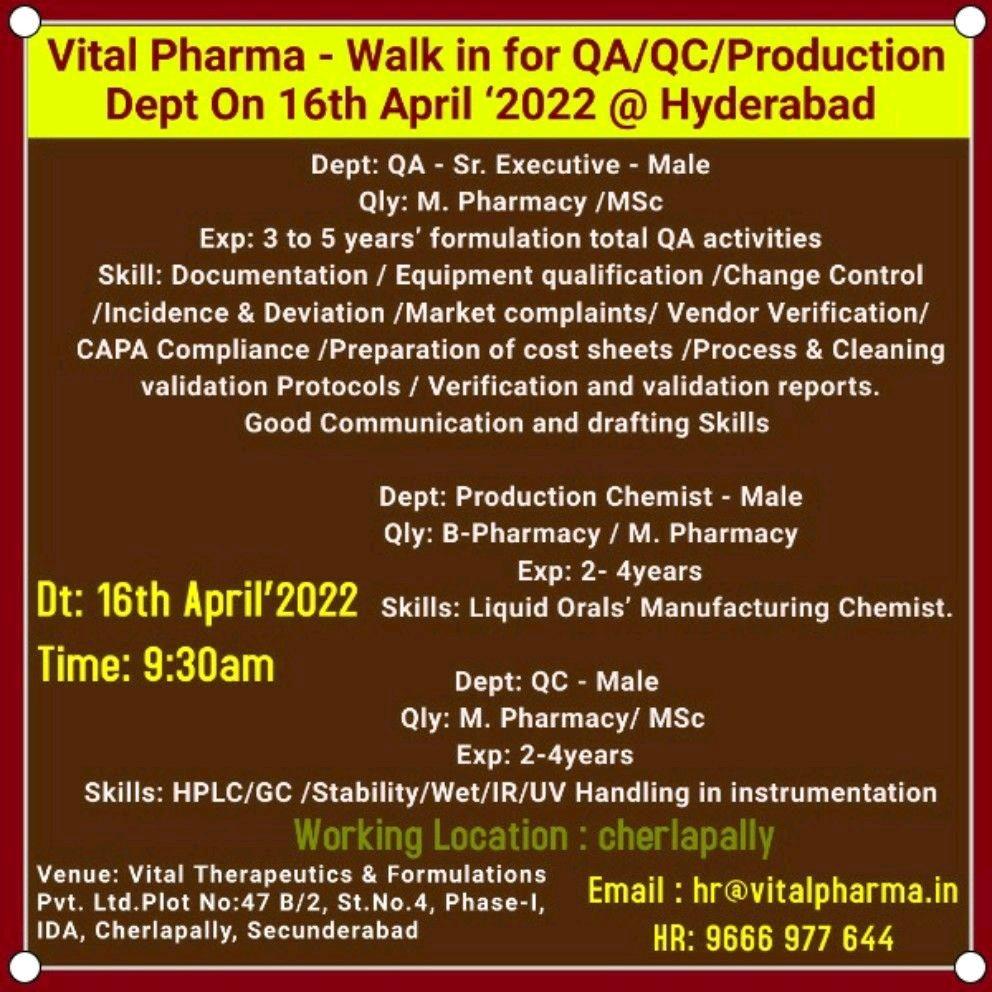 Vital Pharma – Walk in for QA/QC/Production Dept On 16th April ‘2022 @ Hyderabad