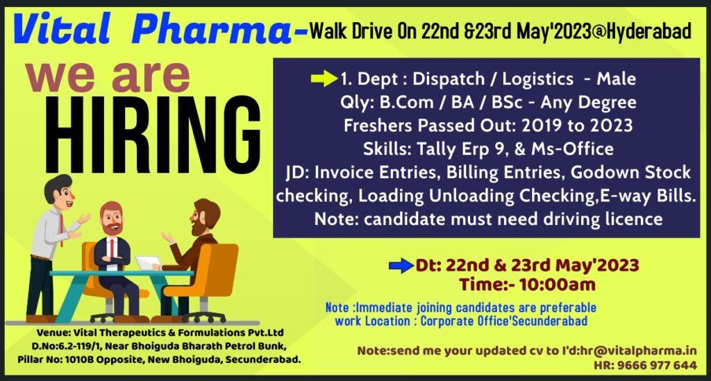 Venue: Vital Therapeutics & Formulations Pvt.Ltd D.No:6.2-119/1, Near Bhoiguda Bharath Petrol Bunk, Pillar No: 1010B Opposite, New Bhoiguda, Secunderabad.