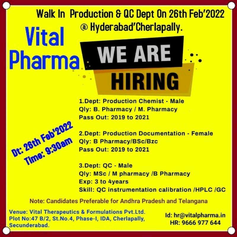 Vital Pharma -Walk-In Interviews for Freshers & Experienced in Production & Quality Control on 26th Feb’2022 @ Hyderabad