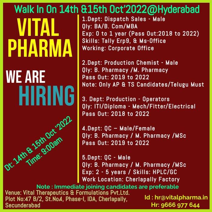 VITAL PHARMA Walk In On 14th &15th Oct’2022 at Hyderabad for Dispatch Sales, Production Chemist/ Operators, QC department