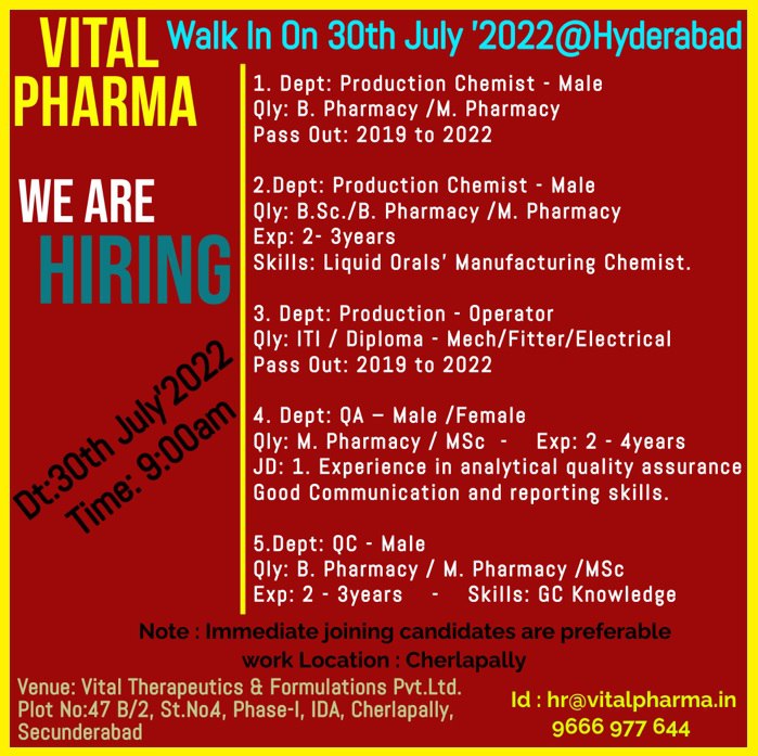 Id : hr@vitalpharma.in 9666 977 644