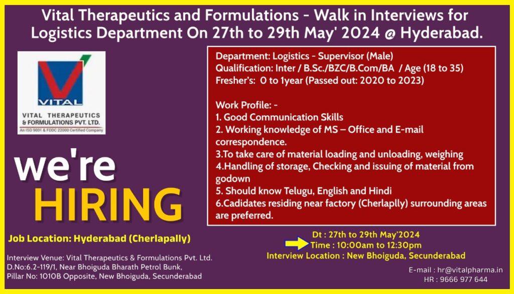 Vital Therapeutics and Formulations – Walk in Interviews for Logistics Department On 27th to 29th May’ 2024 @ Hyderabad.
