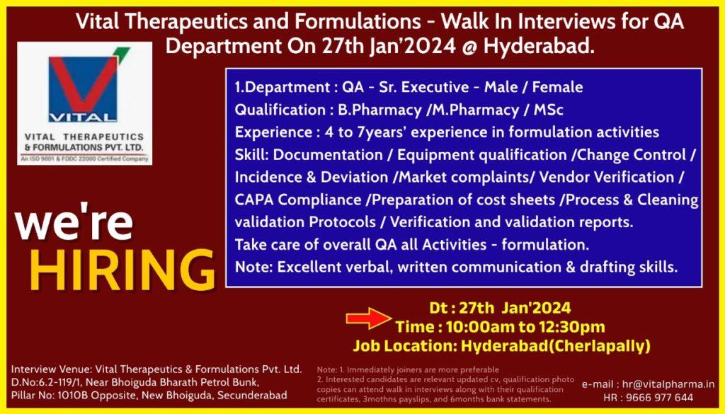 Vital Therapeutics and Formulations – Walk In Interviews for QA Department On 27th Jan’2024 @ Hyderabad