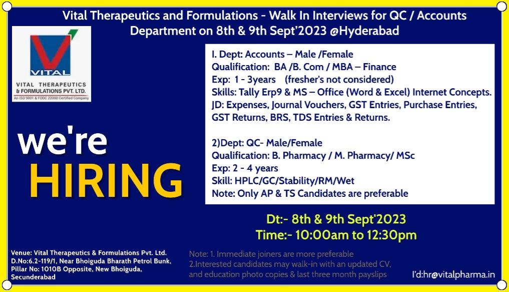 Vital Therapeutics and Formulations- Walk In Interviews for QC / Accounts on 8th & 9th Sept’2023