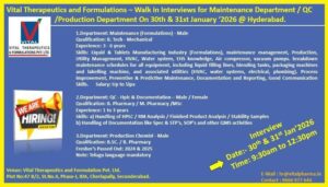 Vital Therapeutics and Formulations Pvt. Ltd. has announced a significant hiring drive through walk-in interviews scheduled for late January 2026. This recruitment event focuses on strengthening their Maintenance, Quality Control, and Production teams at their Secunderabad facility. If you are a pharmaceutical professional or a fresh graduate looking to kickstart your career in a dynamic environment, this is an excellent opportunity to join a growing organization.