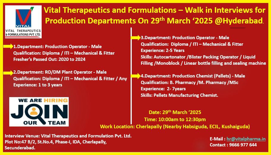 Vital Therapeutics and Formulations – Walk in Interviews for Production Departments On 29th March ‘2025 @Hyderabad.
