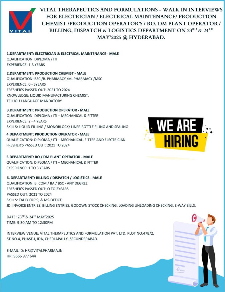 VITAL THERAPEUTICS AND FORMULATIONS – WALK IN INTERVIEWS FOR ELECTRICIAN / ELECTRICAL MAINTENANCE/ PRODUCTION