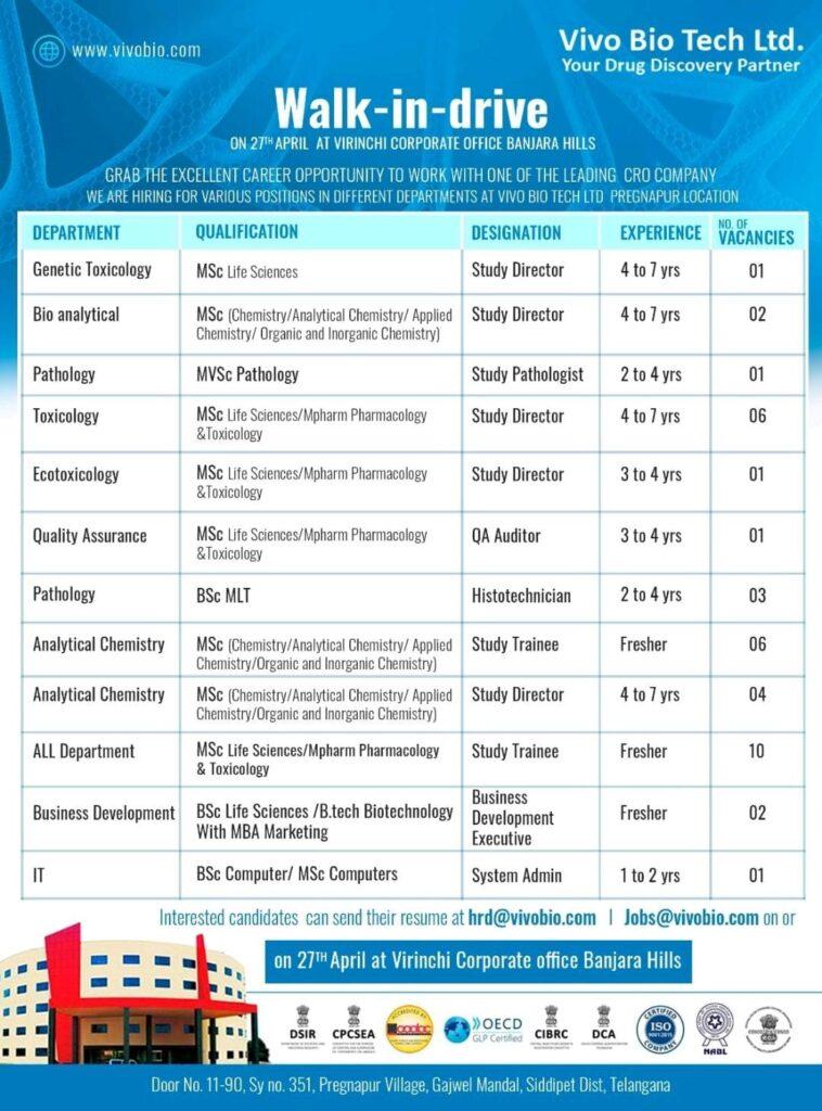 GRAB THE EXCELLENT CAREER OPPORTUNITY TO WORK WITH ONE OF THE LEADING CRO COMPANY WE ARE HIRING FOR VARIDUS POSITIONS IN DIFFERENT DEPARTMENTS AT VIVO BIG TECHLID PREGNAPURAOCATION
