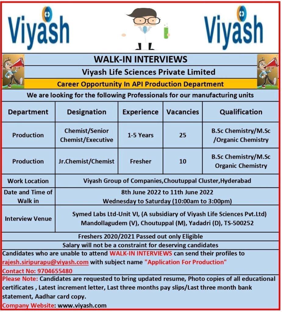 Viyash Life Sciences Private Limited Walk In Interview for 0-5 Years in Production department from 08th to 11 June 2022