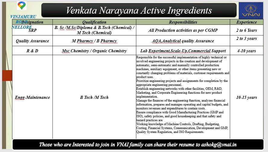 VNAI hiring for Quality Assurance, R & D, Engg-Maintenance, SRP department @Nellore