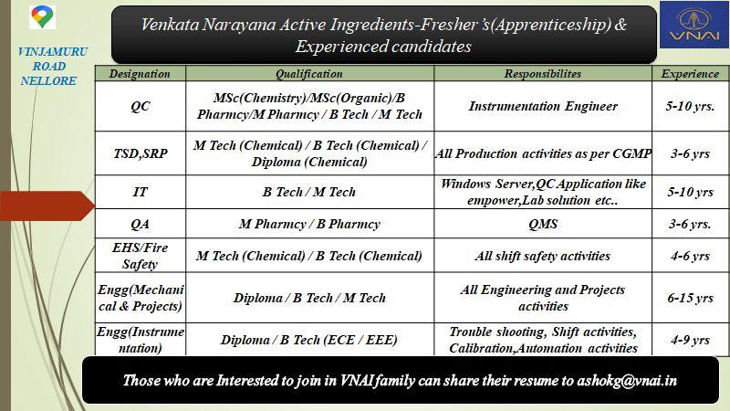 Venkata Narayana Active Ingredients-Fresher ‘s(Apprenticeship) & Experienced candidates