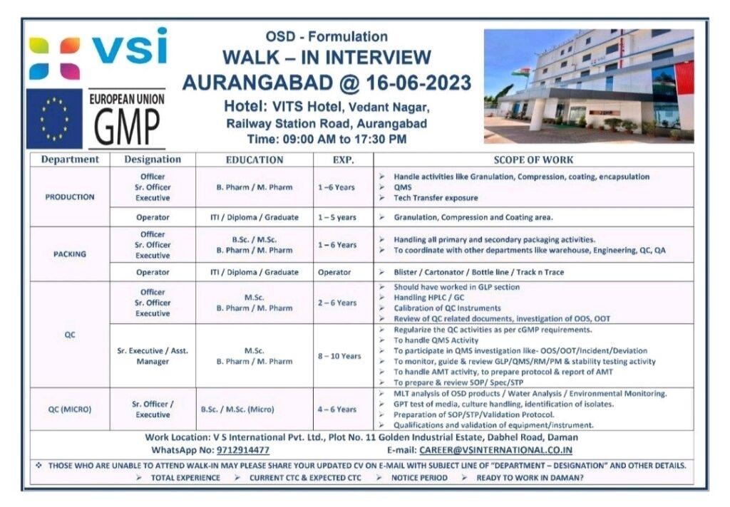 VSI Walk In Interview for OSD Formulation- Production, Packing, QC, Micro on 16th June 2023 @Daman
