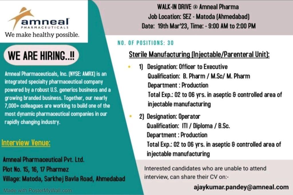 Walk-in Drive @ Amneal Pharma for Manufacturing department (Injectable/ Parenteral) on 19-Mar-23 (Sunday)