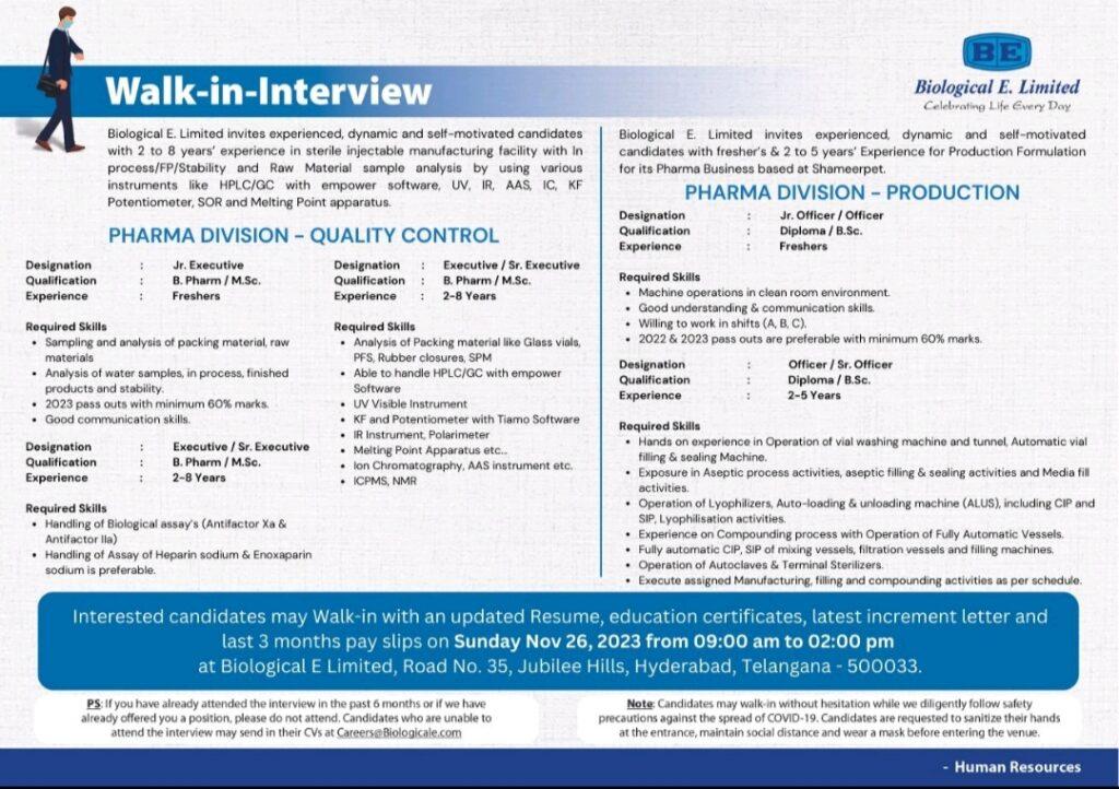 Walk in Drive at Biological E Limited, Jubilee Hills, Hyderabad on 26 November, 2023 from 9am to 2pm.
