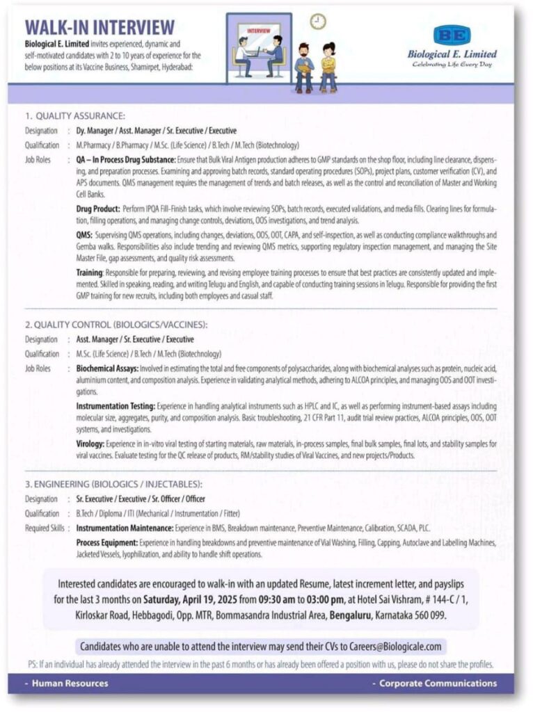 Biological E. Limited invites experienced, dynamic and self-motivated candidates with 2 to 10 years of experience for the below positions at its Vaccine Business, Shamirpet, Hyderabad: