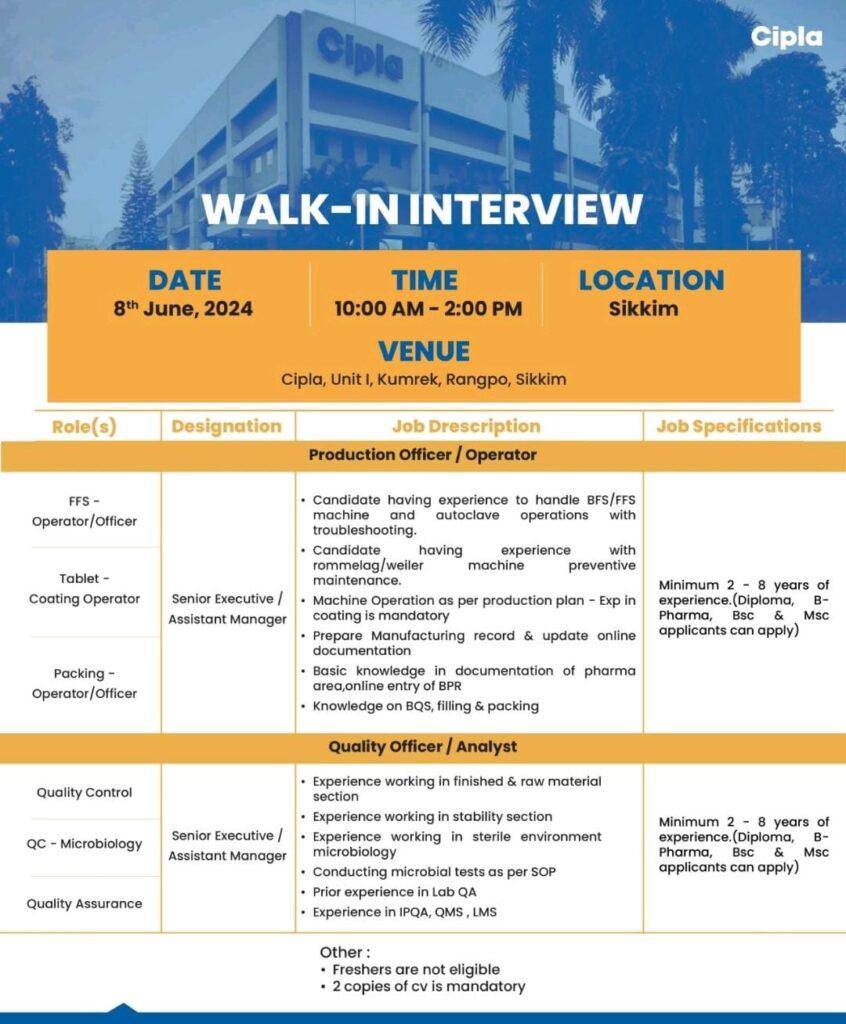 Walk-In Drive at Cipla Unit – I, Kumrek on 8th June (Saturday)