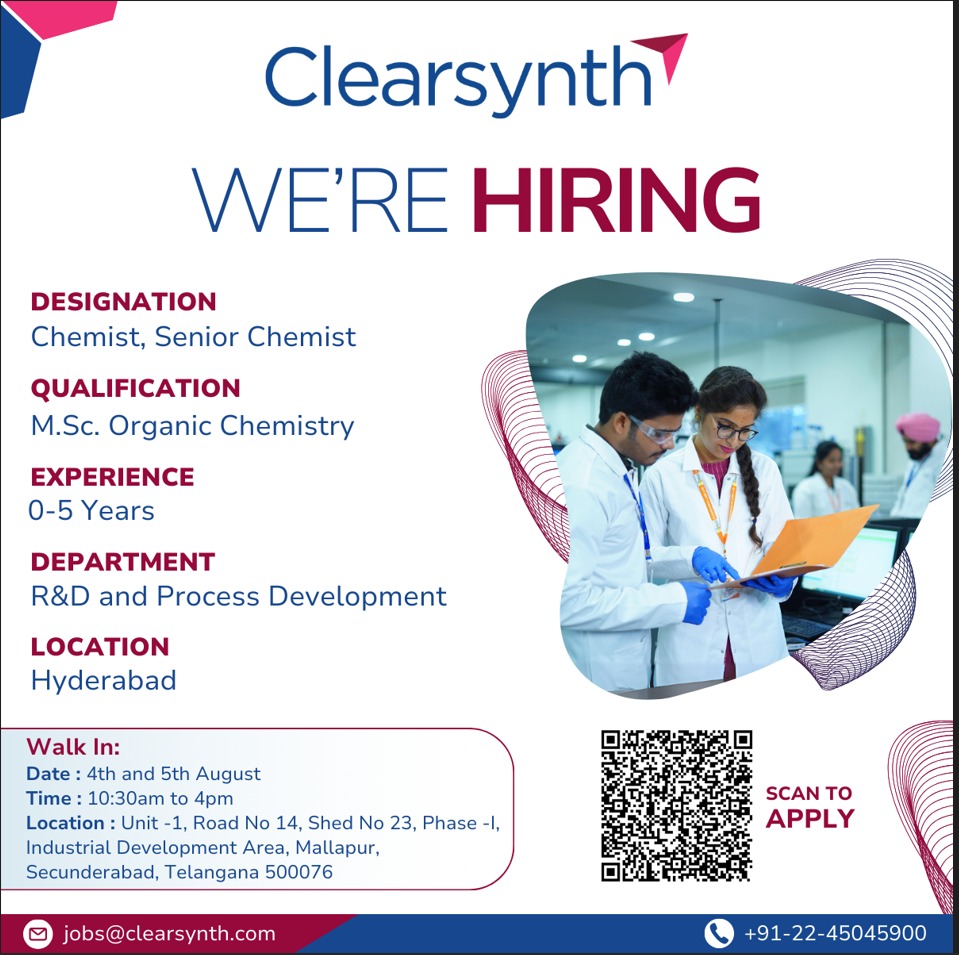 Walk-in Drive at Clearsynth for Freshers & Experienced (0-5 Years) in R&D and Process Development – 4th & 5th August 2024