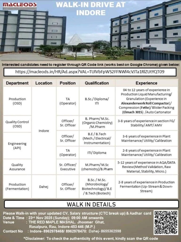 Macleods Pharmaceuticals Ltd., a leading name in the pharmaceutical industry, is conducting a walk-in drive in Indore for multiple roles across its OSD and API manufacturing units. This is a prime opportunity for experienced professionals to join a dynamic team committed to quality and innovation.