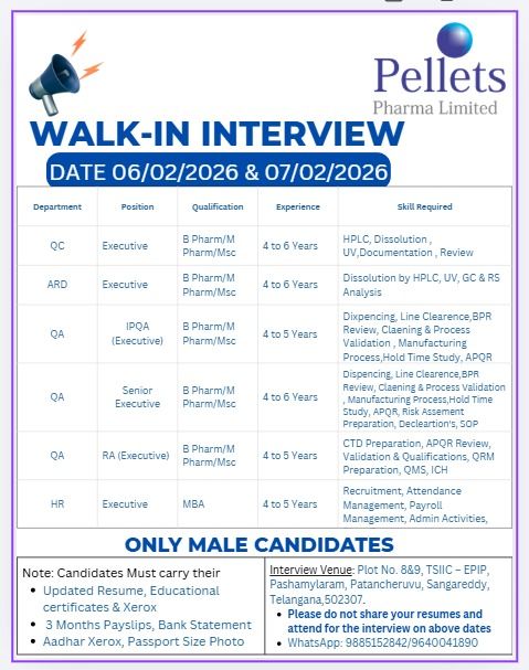 Pellets Pharma Limited is hosting a walk-in interview drive on February 6th and 7th, 2026, targeting experienced male professionals for multiple roles at their facility in Sangareddy, Telangana. If you have a background in Quality Control, Quality Assurance, or Human Resources, this is a prime opportunity to advance your career with a leading name in the pharmaceutical industry.
