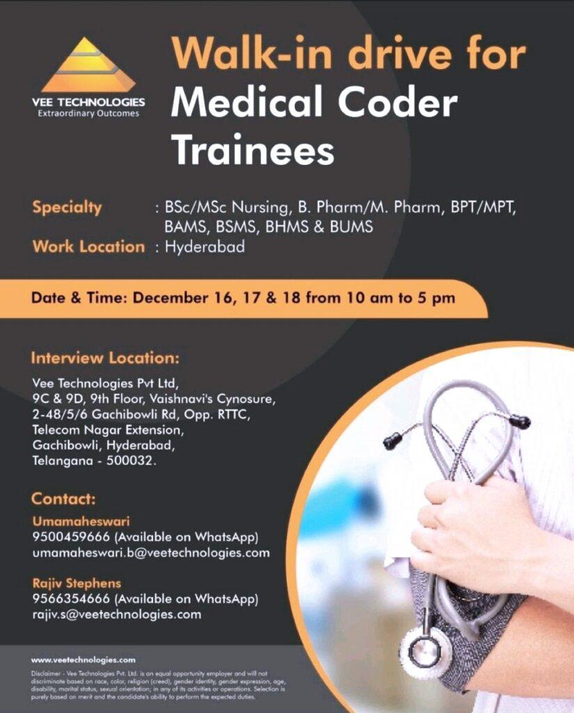 Walk-in drive for Medical Coder Trainees on 17th & 18th December 2022 @Vee Technologies Pvt Ltd, Hyderabad