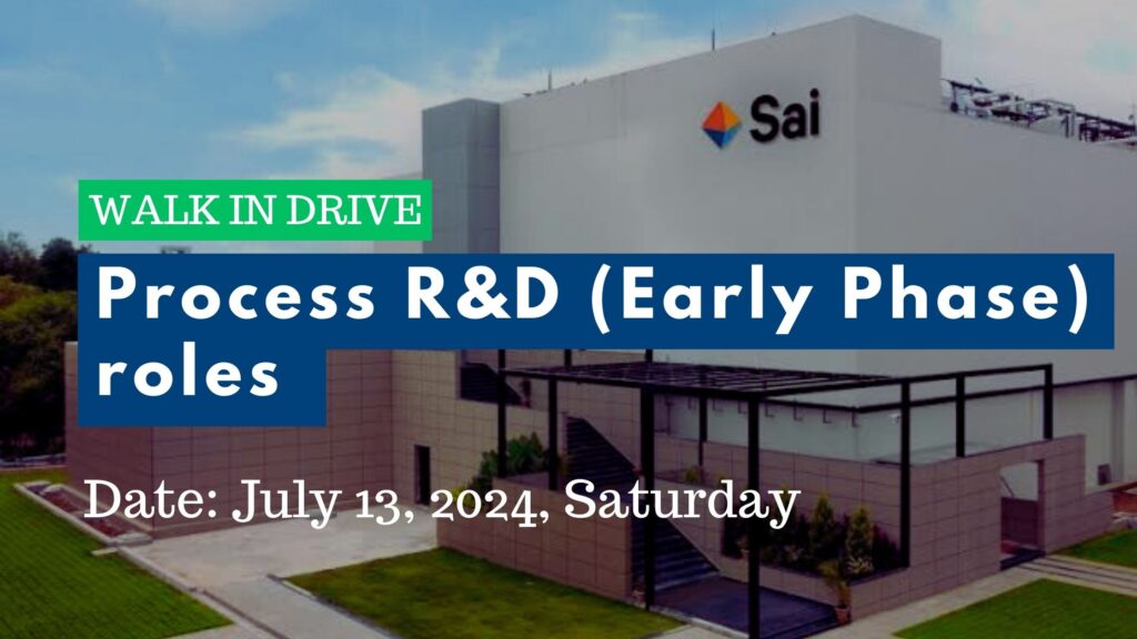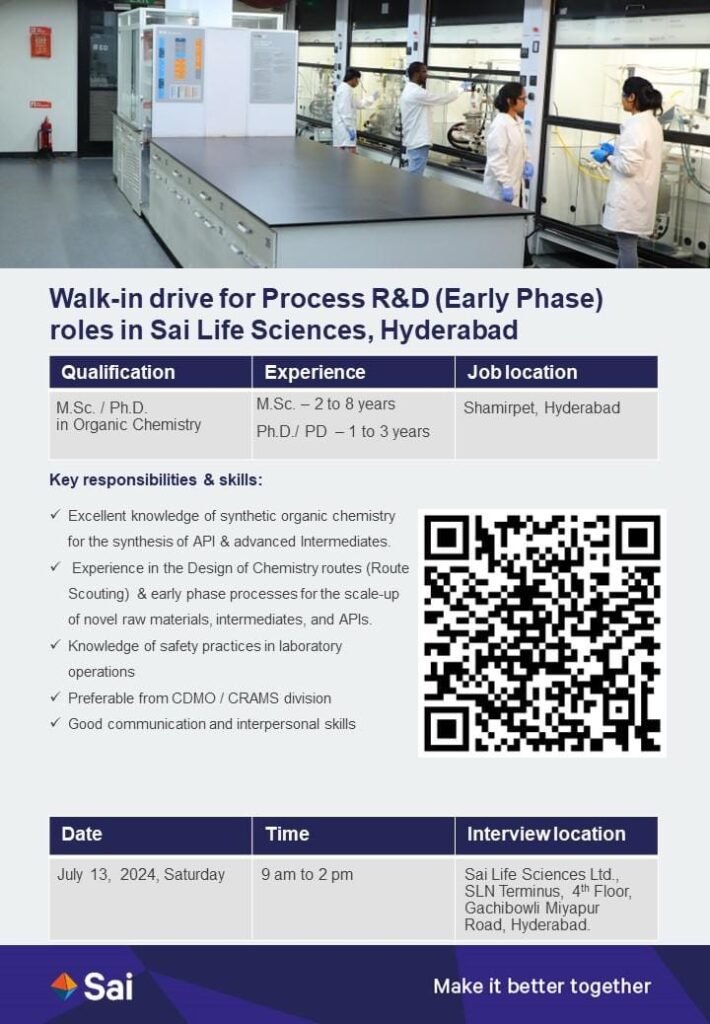 Walk-in drive for Process R&D (Early Phase) roles in Sai Life Sciences, Hyderabad on July 13, 2024, Saturday