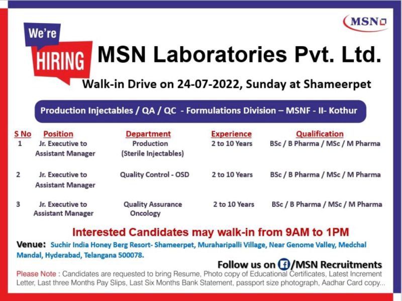 Walk in Drive for Production / Quality Assurance / Quality Control Formulations Departments on Sunday 24th July 2022 – MSN Laboratories Pvt. Ltd.