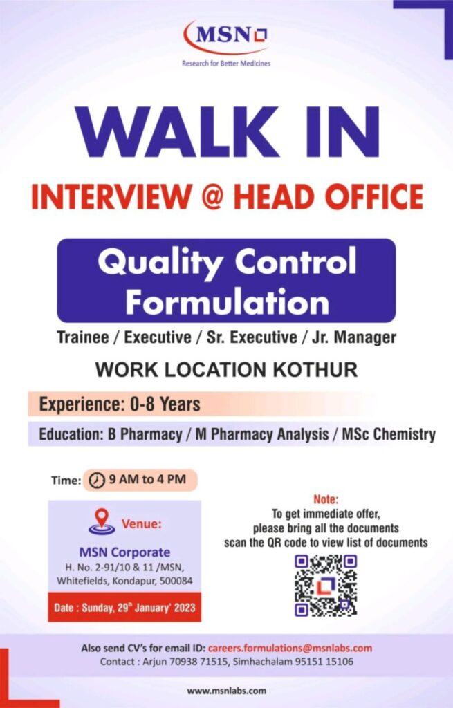 Walk In Drive for Quality Control Formulation on Sunday 29th January 2023 @ MSN Corporate Office, Whitefields , Kondapur, Hyderabad