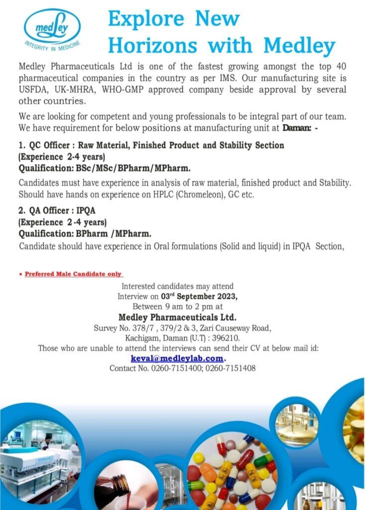 Walk-in Drive on 03/09/2023 (Sunday) for QC/ QA Department at Medley Pharmaceuticals Ltd, Daman (UT)