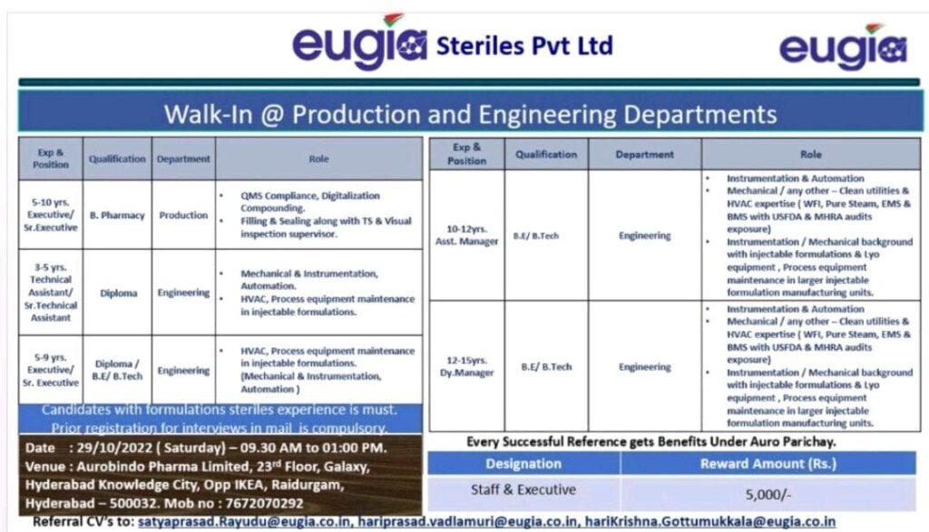 Walk-In for Production and Engineering Departments on 29/10/2022 at Aurobindo Pharma Limited