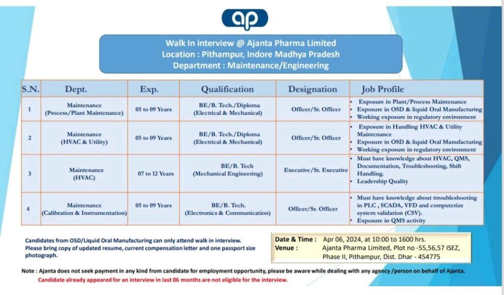 Note: Ajanta does not seek payment in any kind from candidate for employment opportunity, please be aware while dealing with any agency/person on behalf of Ajanta. Candidate already appeared for an interview in last 06 months are not eligible for the interview.