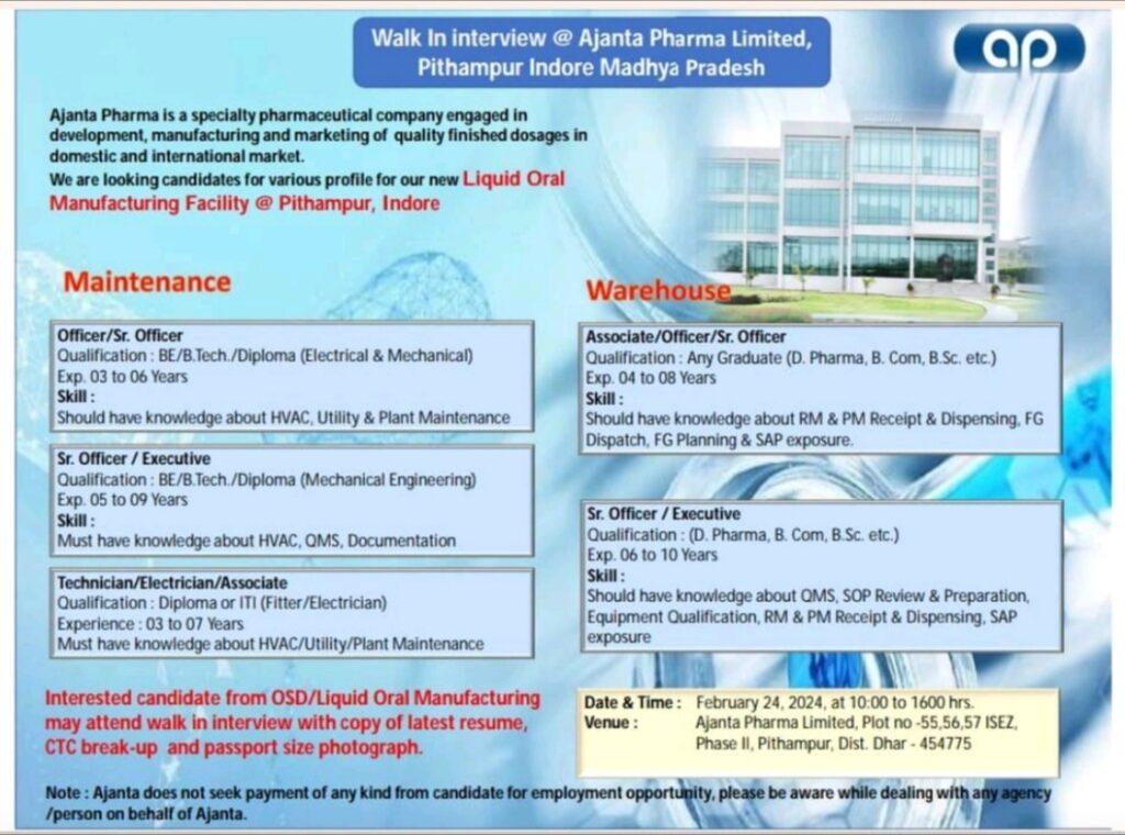 Walk in interview @ Ajanta Pharma Limited, Pithampur, Indore on February 24, 2024