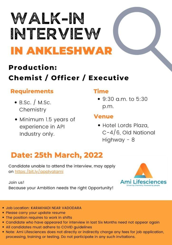 Walk-In Interview – Ankleshwar – Ami Lifesciences Pvt. Ltd. for Production Chemist / Officer / Executive on 25th March 2022