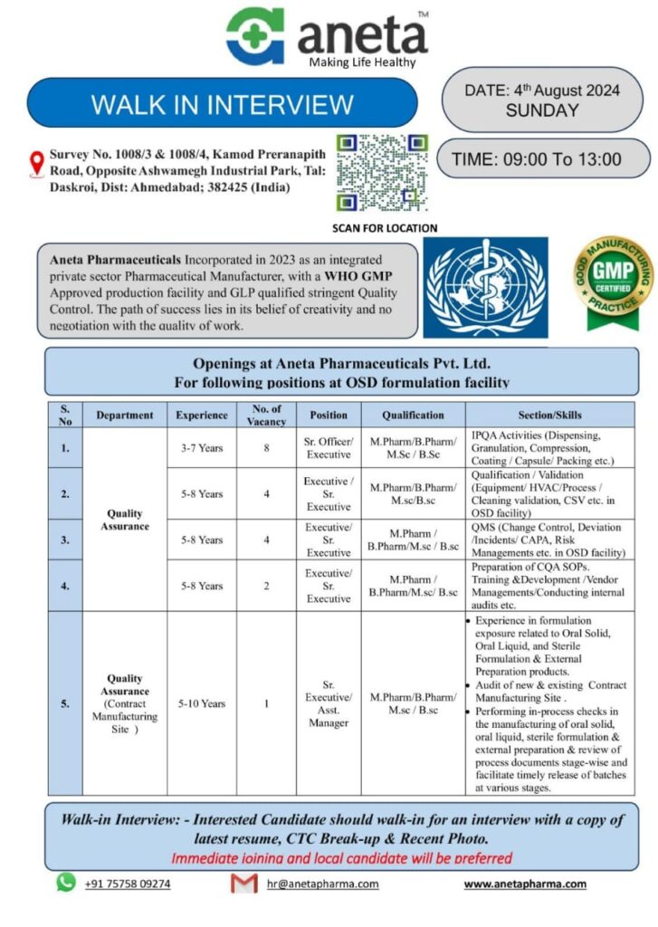 Openings at Aneta Pharmaceuticals Pvt. Ltd. For Sr. Officer to Asst. Manager in Quality Assurance department- walk in interview on 4th August 2024