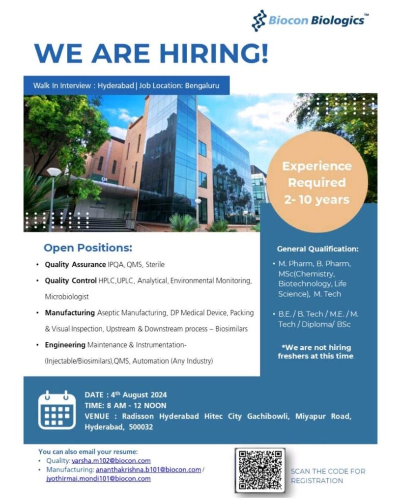 Biocon Biologics Walk In Interview for QA, QC, Microbiologist, Engineering & Manufacturing on 4th August 2024